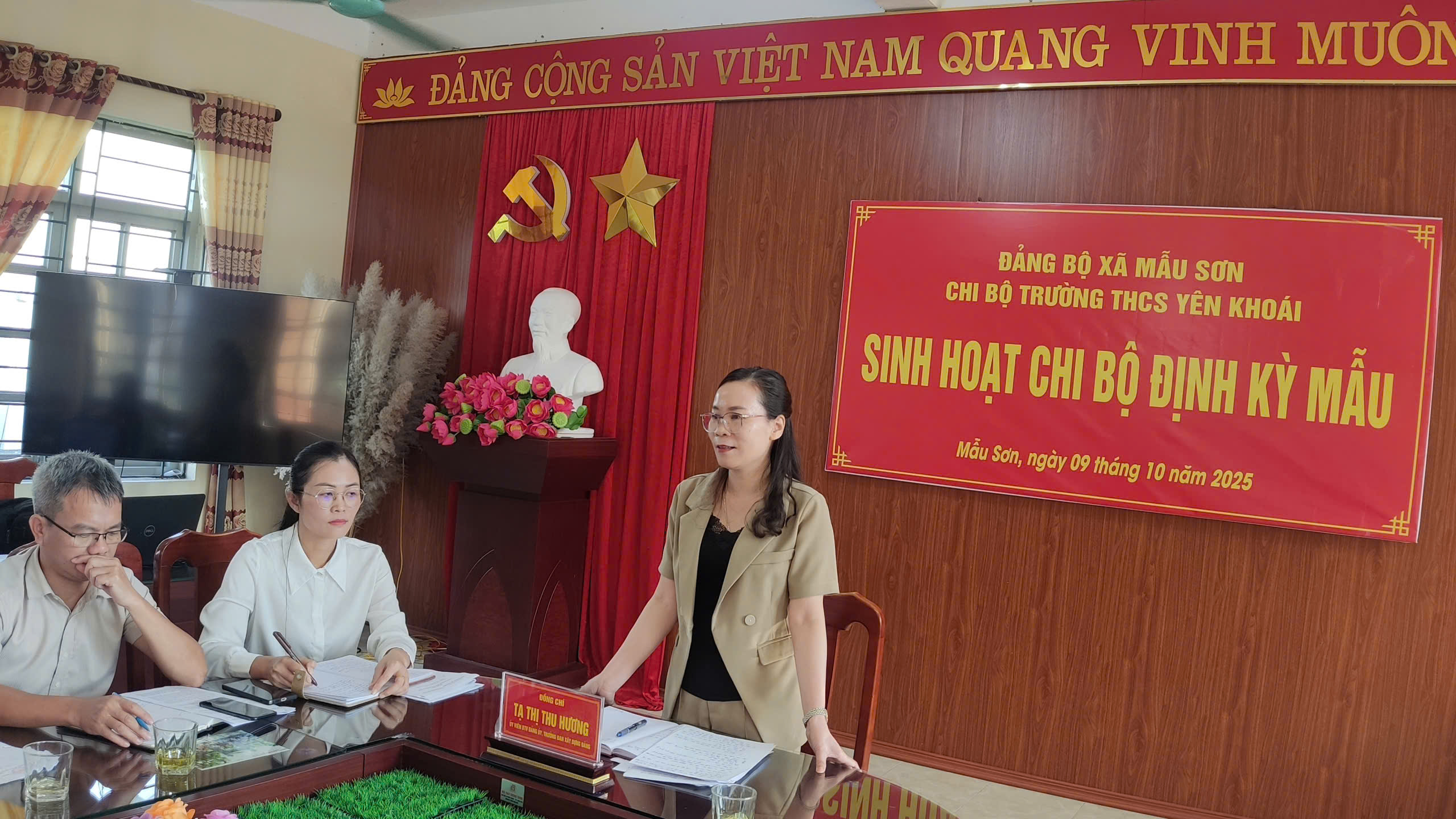 Chiều ngày 09/10/2025, Chi bộ Trường THCS Yên Khoái tổ chức sinh hoạt chi bộ thường kỳ mẫu tháng 10 năm 2025. Đây là Chi bộ cơ sở được Đảng bộ xã Mẫu Sơn lựa chọn thực hiện sinh hoạt thường kỳ mẫu để các chi bộ cơ sở trực thuộc Đảng bộ xã và chi bộ trực thuộc Đảng bộ các cơ quan đảng xã tham khảo, học tập. Dự buổi sinh hoạt mẫu có đồng chí Tạ Thị Thu Hương, Ủy viên Ban Thường vụ Đảng ủy, Trưởng ban Xây dựng đảng.
