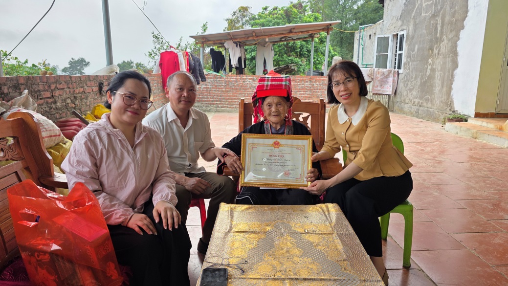 Đồng chí Hoàng Thị Thuý – Bí thư Đảng ủy, Chủ tịch HĐND xã thăm, tặng quà chúc thọ bà Nông Thị Tiến, thôn Bản Khoai