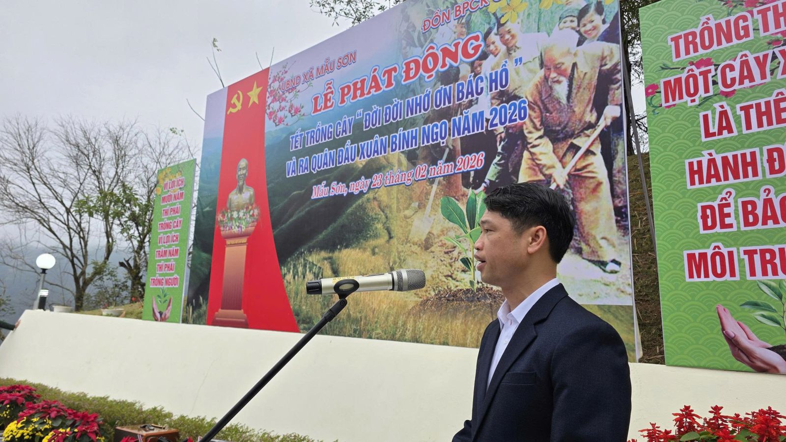 Thực hiện Kế hoạch số 20/KH-UBND ngày 26/01/2026 của UBND xã Mẫu Sơn về tổ chức “Tết trồng cây đời đời nhớ ơn Bác Hồ” và ra quân làm đường giao thông nông thôn, thủy lợi, nước sinh hoạt, vệ sinh môi trường Xuân Bính Ngọ năm 2026. Ngày 23/02/2026, UBND xã Mẫu Sơn phối hợp với Đồn Biên phòng Cửa khẩu Chi Ma tổ chức Lễ phát động “Tết trồng cây đời đời nhớ ơn Bác Hồ” tại khuôn viên điểm cao Chốt 424.