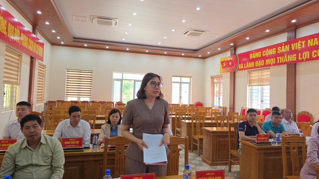 Đồng chí Mai Thị Phương Bình - Phó Giám đốc PGD NHCSXH Lộc Bình đã trình bày dự thảo phân công nhiệm vụ cho các thành viên Ban đại diện và báo cáo kết quả hoạt động tín dụng chính sách trên địa bàn xã