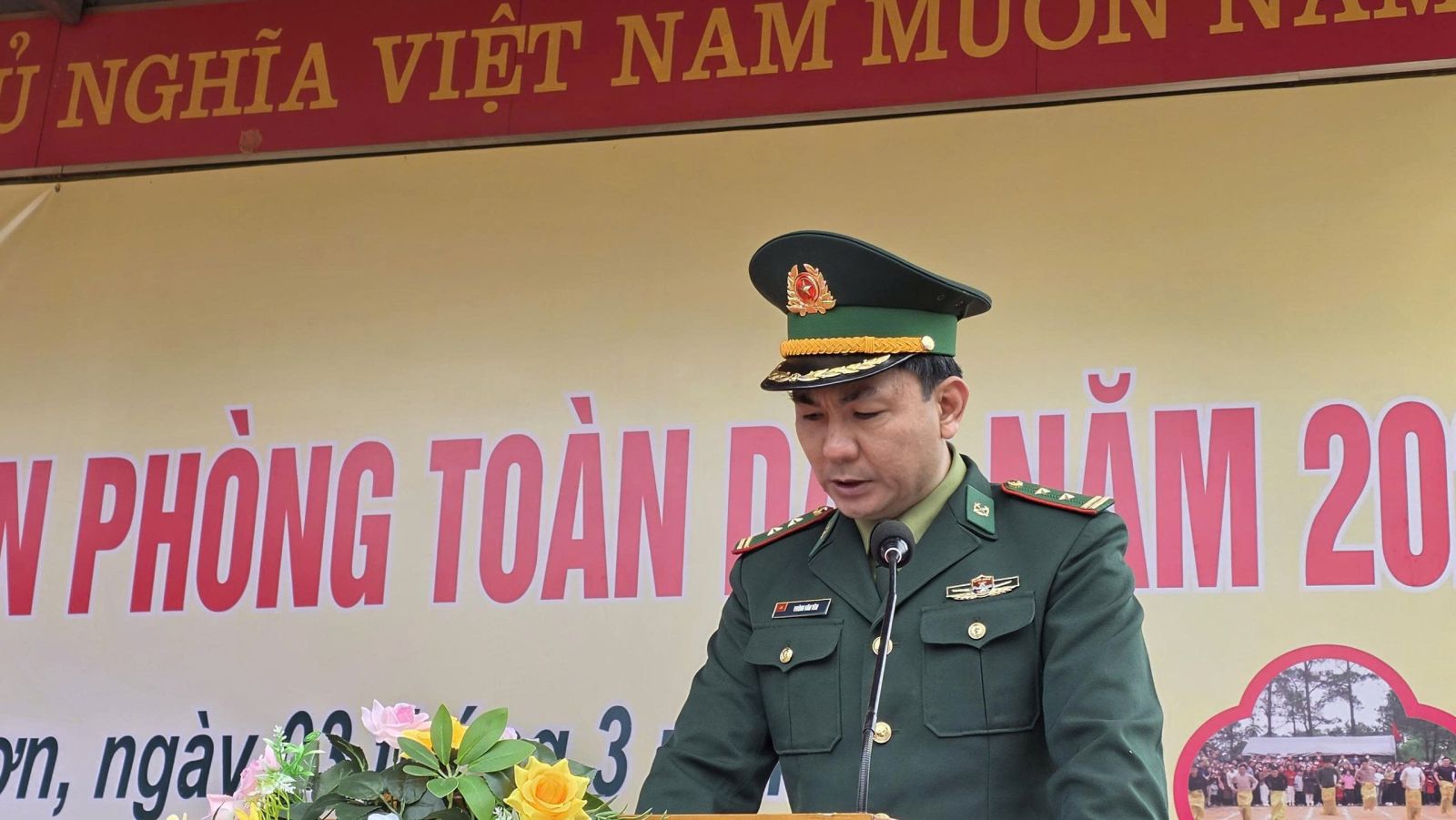 Đồng chí Trung tá Phùng Văn Yên, Đồn trưởng Đồn biên phòng cửa khẩu Chi Ma phát động phong trào toàn dân tham gia bảo vệ chủ quyền lãnh thổ, an ninh biên giới quốc gia, trật tự an toàn xã hội khu vực biên giới năm 2026 và tổ chức ký cam kết thực hiện phong trào.