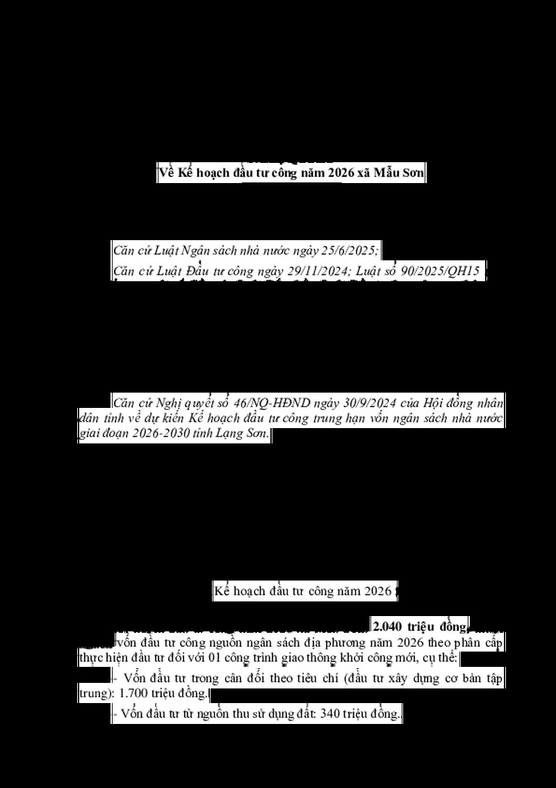 Tiêu đề văn bản NGHỊ QUYẾT Về Kế hoạch đầu tư công năm 2026 xã Mẫu Sơn