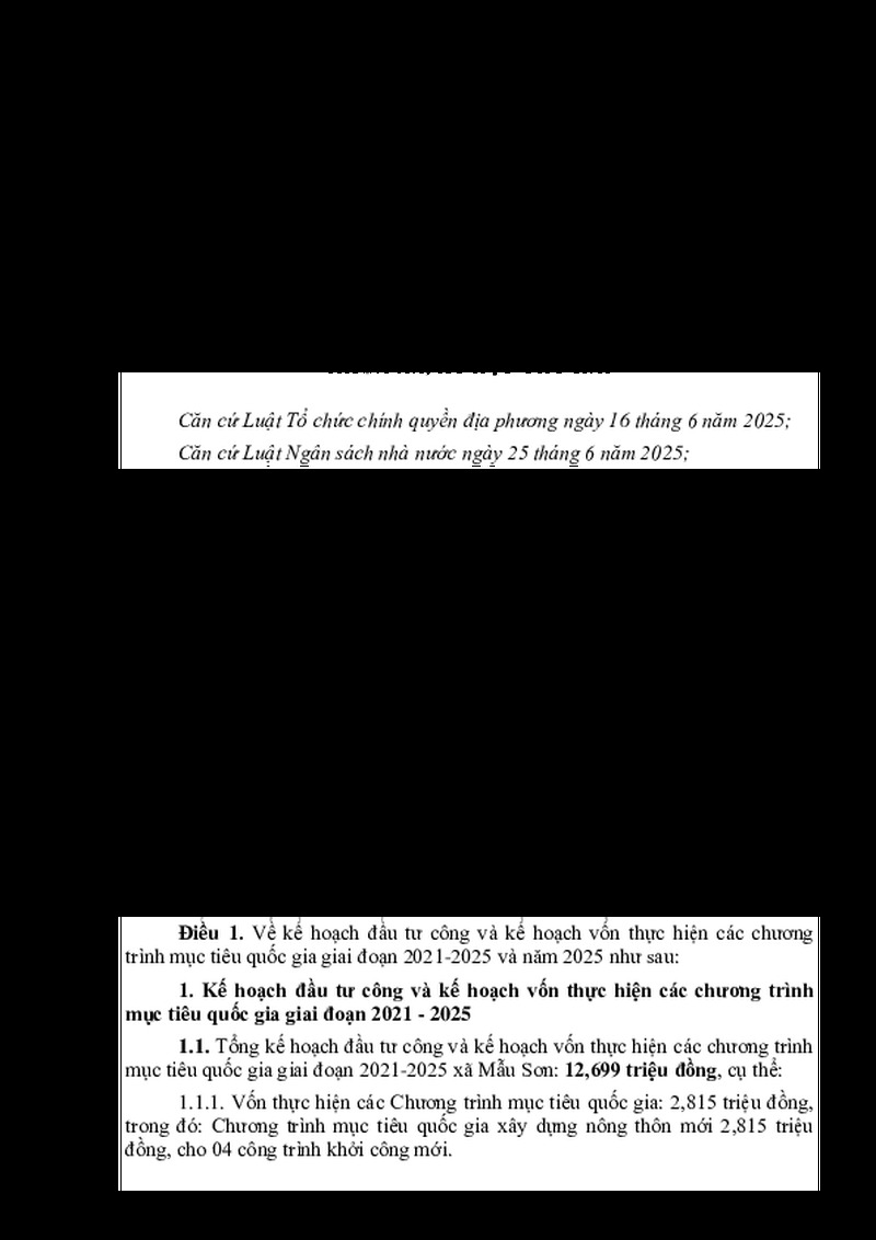 | Tiêu đề văn bản | NGHỊ QUYẾT Về Kế hoạch đầu tư công và kế hoạch vốn thực hiện các chương trình mục tiêu quốc gia giai đoạn 2021 - 2025 và năm 2025 xã Mẫu Sơn | ||