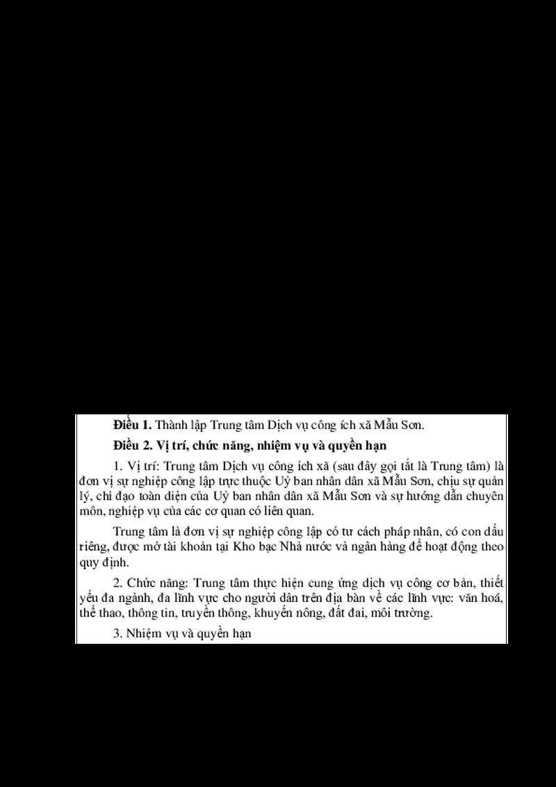 | Tiêu đề văn bản | QUYẾT ĐỊNH Thành lập Trung tâm Dịch vụ công ích xã Mẫu Sơn | ||