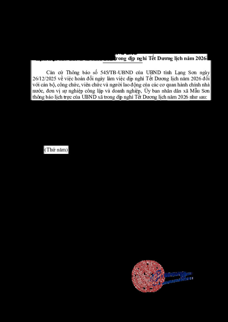 | Tiêu đề văn bản | THÔNG BÁO Lịch trực của UBND xã Mẫu Sơn trong dịp nghỉ Tết Dương lịch năm 202 | ||